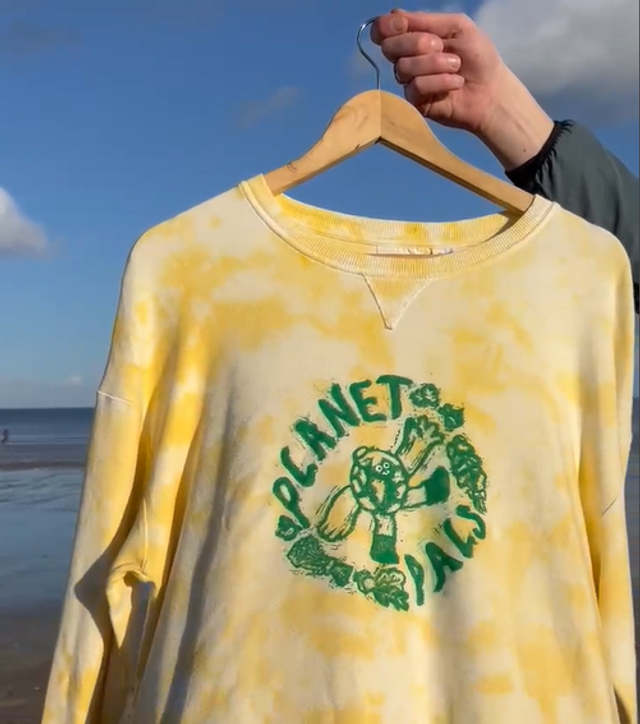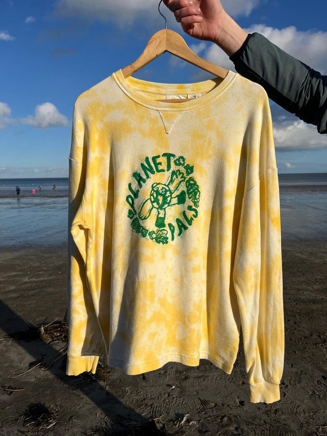 Upcycled and given a new life, these Planet Pal t-shirts are one of a kind. Created with all things green in mind, this collection is printed from a handcarved lino block design and tie dyed with earth friendly dyes on cotton clothing.