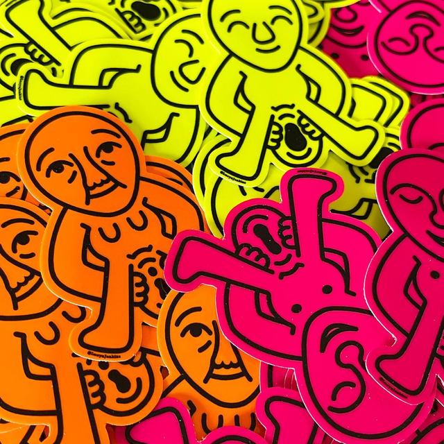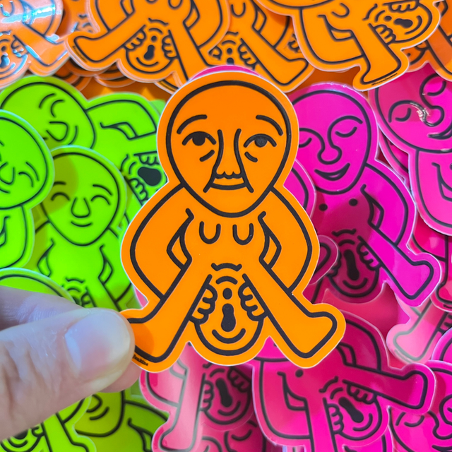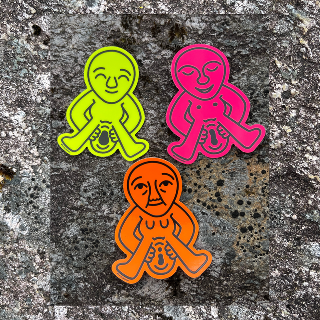 Hard wearing and durable, these fluro Sheela na Gig vinyl stickers will make your heart pop.