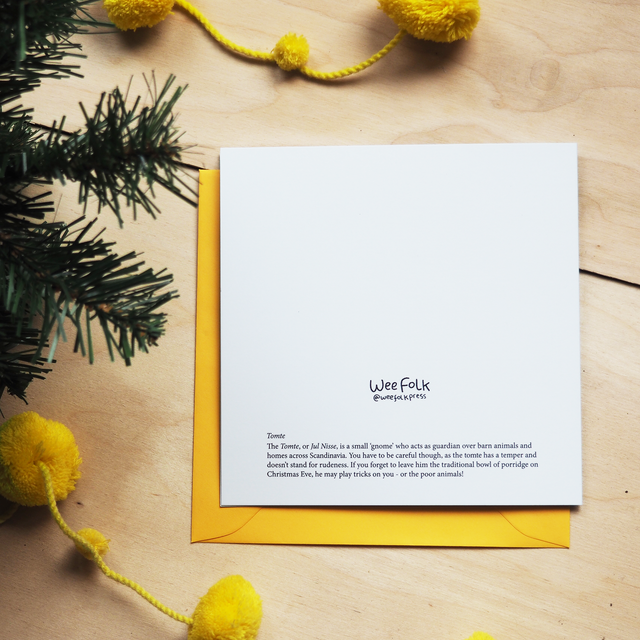 'The Tomte, or Jul Nisse is a small 'gnome' who acts as guardian over barn animals and homes across Scandinavia. You have to be careful though, as the tomte has a temper and doesn't stand for rudeness. If you forget to give him the traditional bown of porridge on Christmas Eve, he may play tricks on you - or the poor animals!'